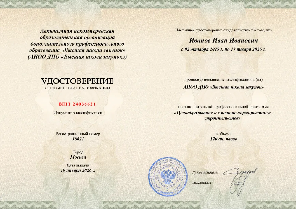 Повышение квалификации, 120 академических часов, 7 модулей: современное ценообразование и нормативная база, сметно-нормативные базы в строительстве, экономика сметной стоимости, определение стоимости ресурсов и конъюнктурный анализ, особенности расчёта стоимости монтажа и пусконаладочных работ, практическое составление смет в MS Excel, работа в программе «ГРАНД-Смета». Онлайн-обучение в в Нижнем Новгороде с итоговой аттестацией.