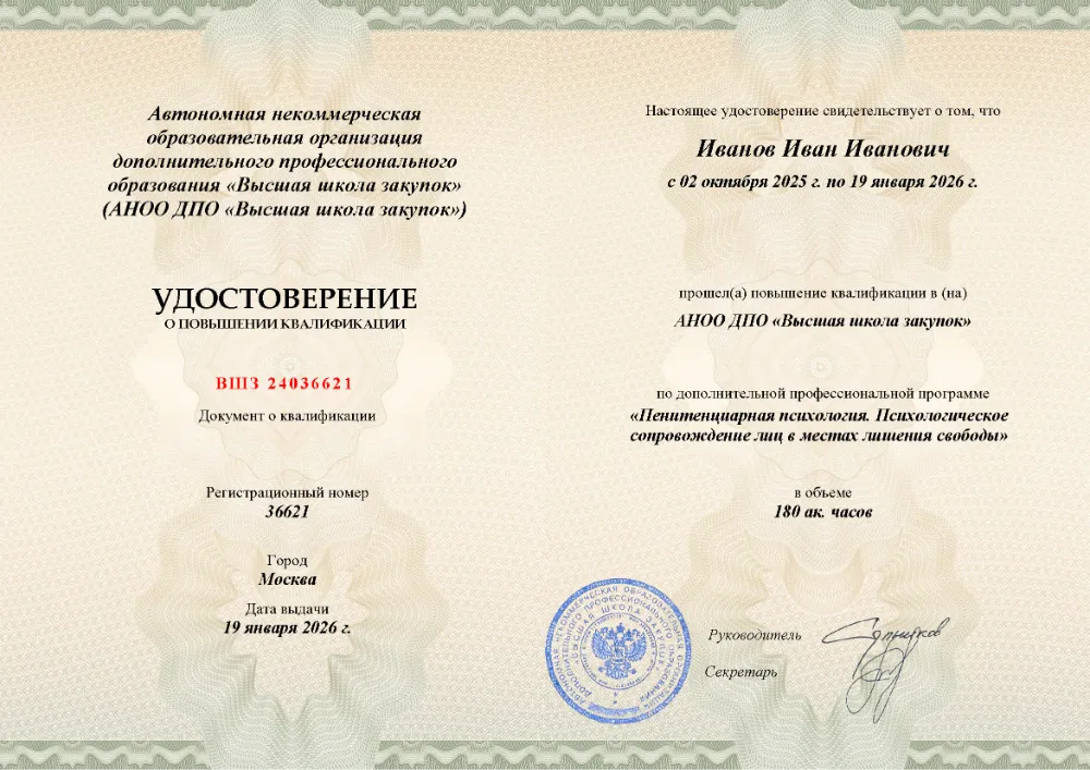 Повышение квалификации, 120 академических часов, 14 модулей: теоретико-методологические основы и нормативное обеспечение, криминальная и виктимологическая психология, судебно-психологическая экспертиза, психология следствия и судебного процесса, работа с осужденными и профилактика правонарушений. Онлайн-обучение в в Нижнем Новгороде с итоговой аттестацией.
